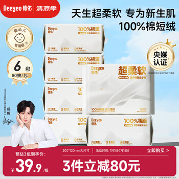 自营德佑超柔棉柔巾100%棉源纤维婴儿洗脸巾干湿两用新生儿洁面巾80抽*6包