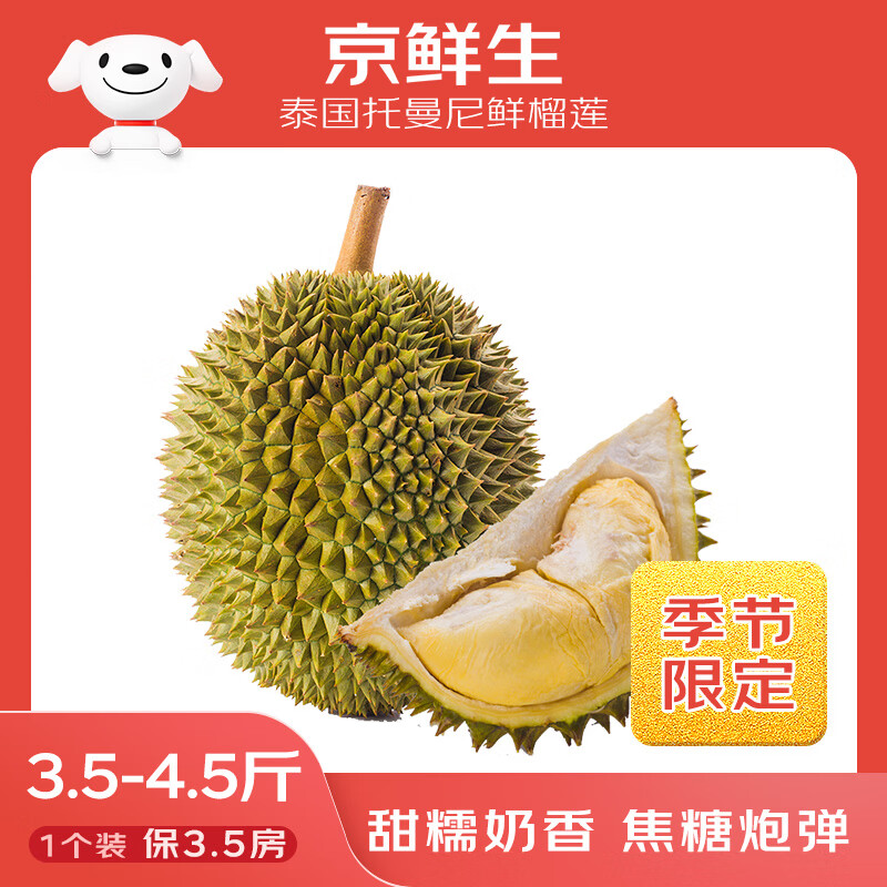 自营京鲜生泰国进口托曼尼鲜榴莲3.5-4.5斤 1个装 新鲜水果 源头直发 包邮