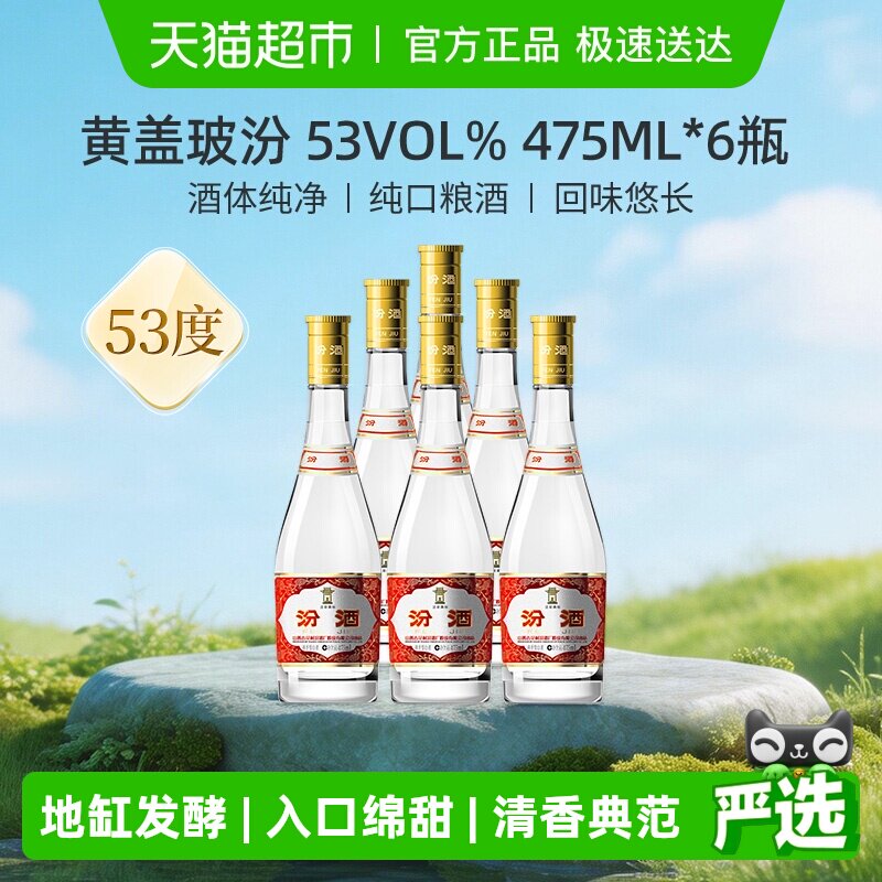 汾酒山西杏花村53度黄盖玻汾475ml*6瓶清香型白酒整箱装口粮酒