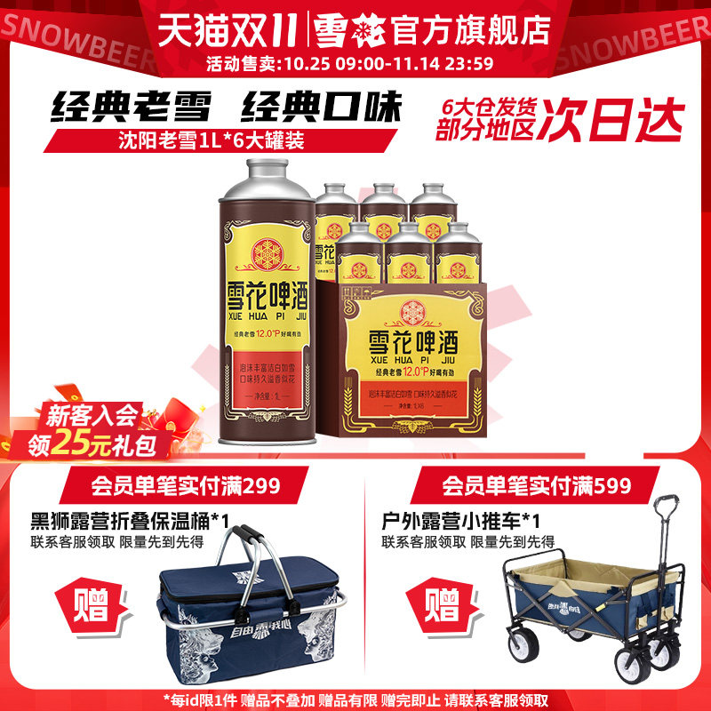 旗舰店雪花啤酒经典沈阳老雪1L*6大罐装老雪马口铁120天保鲜 官方旗舰店