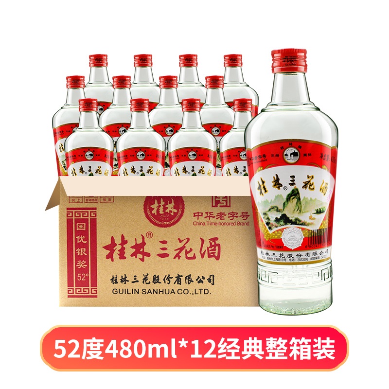 旗舰店桂林三花酒玻瓶高三米香型优级纯粮白酒12瓶整箱52度480ml
