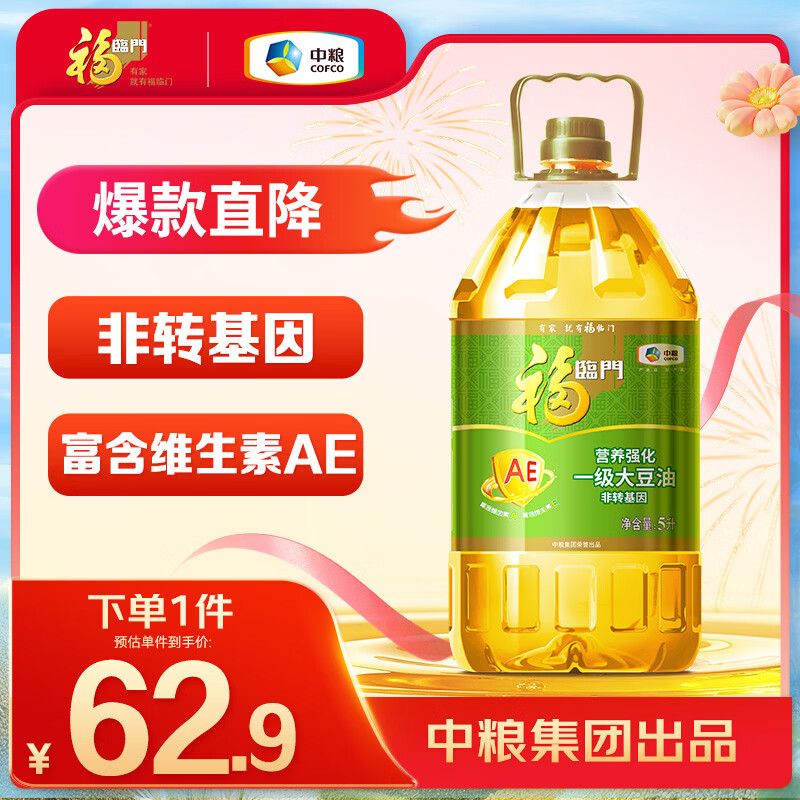 自营福临门食用油非转基因AE一级大豆油5L豆油 富含维生素AE中粮出品