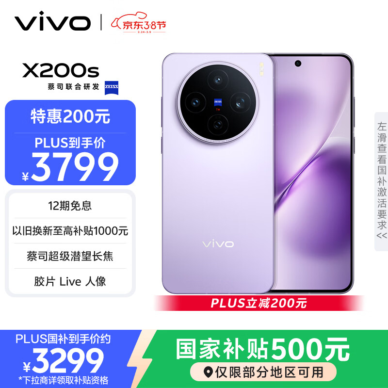 自营vivo X200s 12GB+512GB 淡紫 国家补贴 蔡司超级潜望长焦 湿手秒开超声波指纹 拍照 AI手机