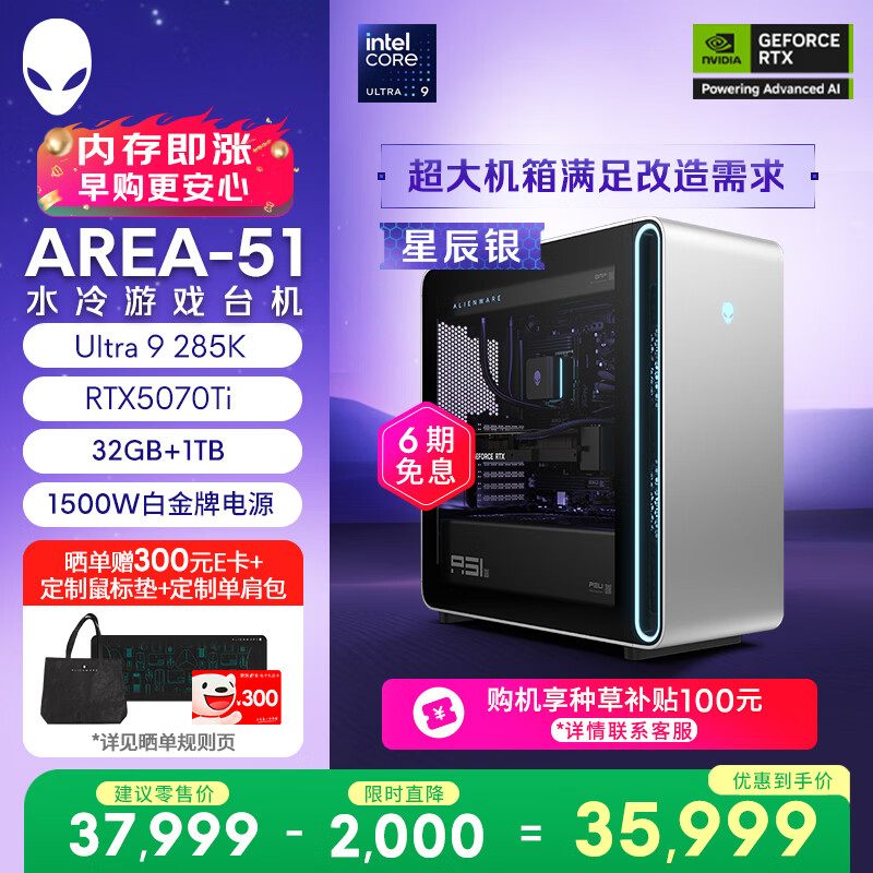 自营外星人台式机 Area-51 高端电竞 游戏台式电脑(Ultra 9 32G 1T RTX5070Ti)星辰银 水冷 80L黑神话 Ai图站