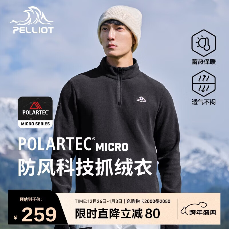 自营伯希和(Pelliot)[P系列]Polartec抓绒衣男秋防风冲锋衣内胆摇粒绒外套11331003黑L
