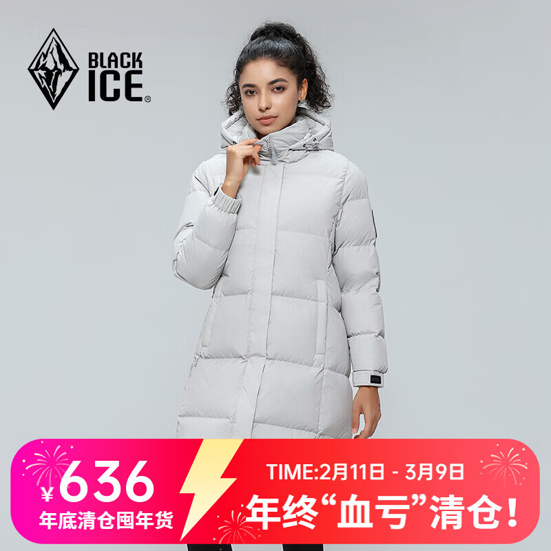 旗舰店黑冰户外女连帽中长款鸭绒羽绒服冬季防风保暖羽绒服 FAF8958 灰白 M