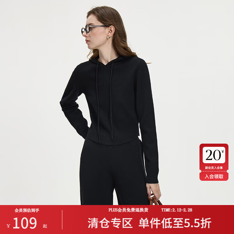 旗舰店范思蓝恩短款连帽套头毛衣女秋冬2024新款针织衫长裤套装14176 黑色上衣 XS