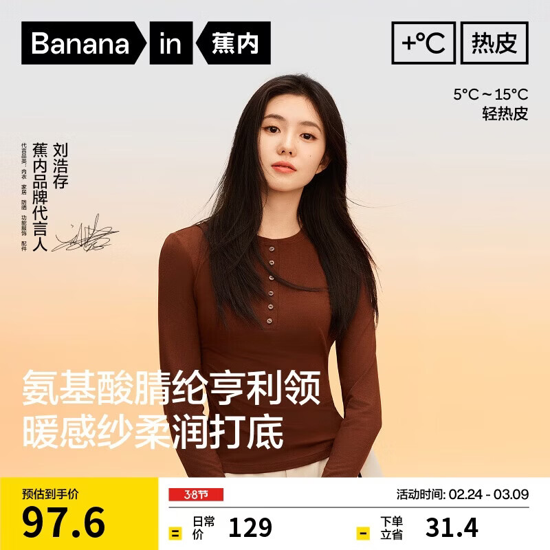 自营蕉内【刘浩存同款】热皮301+女士氨基酸亨利领打底衣秋冬保暖内搭长袖