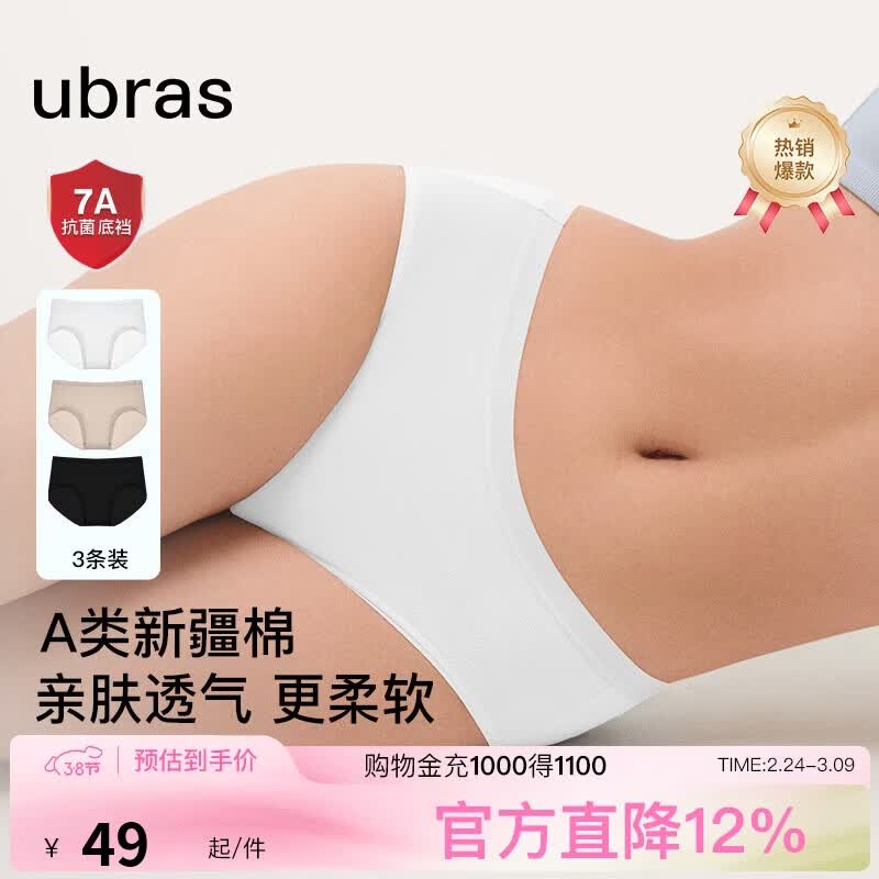 自营ubras【纯棉】7A抗菌裆透气舒适女士内裤女中腰三角裤(3条装)