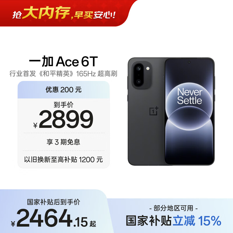 自营一加 Ace 6T 12GB+512GB 闪速黑 oppo 第五代骁龙 8 165Hz 超高刷电竞屏 学生游戏拍照手机 国家补贴