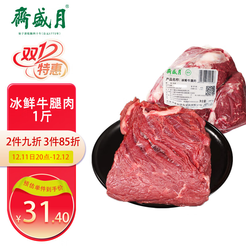自营月盛斋【冰鲜牛肉】国产牛腿肉1斤 内蒙牛肉生鲜鲜肉 中华老字号