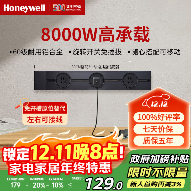 自营霍尼韦尔(Honeywell)A8轨道插座明装 可移动墙壁插座免打孔壁挂式 滑动轨道排插黑50cm