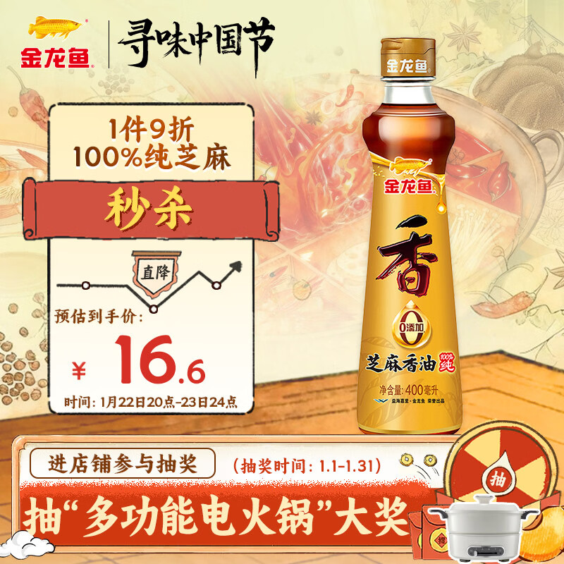 自营金龙鱼纯芝麻香油 400ml【一级】凉拌 调味 烹饪 火锅 调味油 玻璃瓶