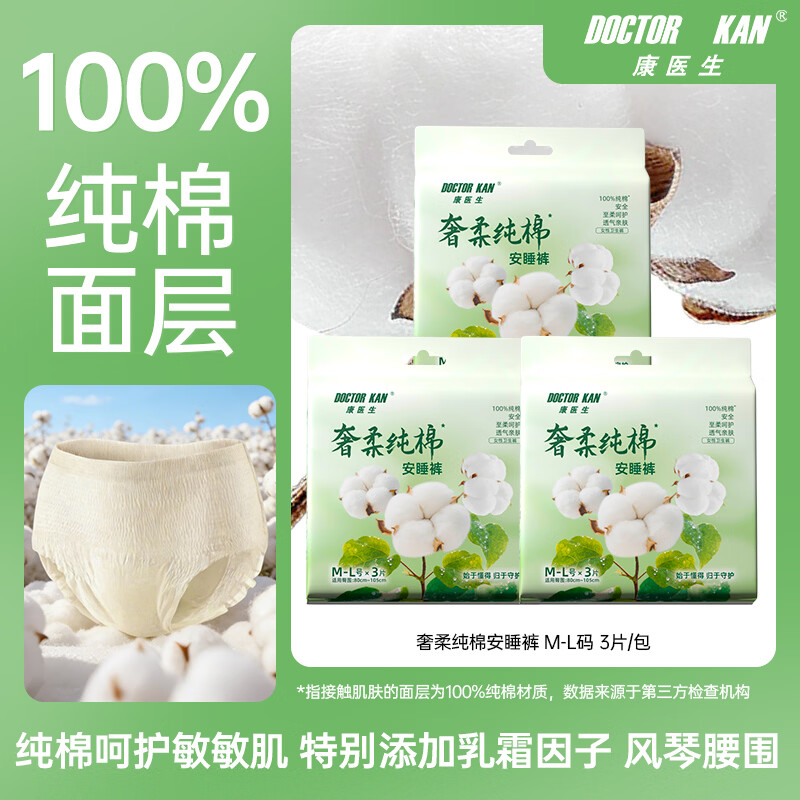 旗舰店康医生纯棉安睡裤安心裤安全裤 姨妈巾裤型卫生巾 呵护敏肌安全裤生理裤 M-L码 3条 100-140斤 纯棉安睡裤1包3条