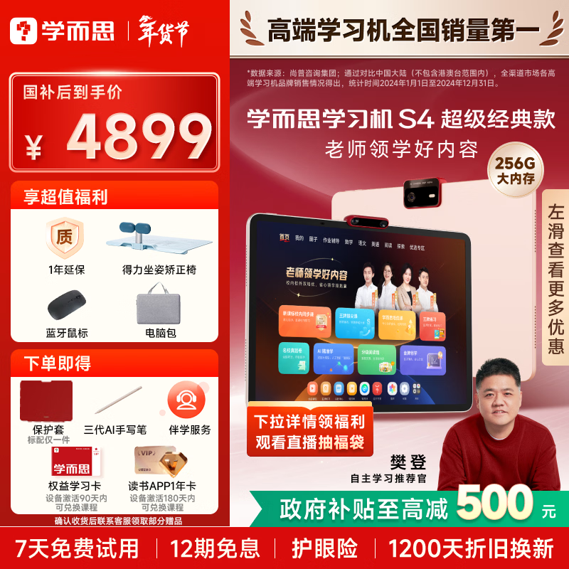 自营学而思学习机S4 (8+256GB)超级经典款 护眼好屏 校内同步课培优课 学习平板 九章大模型 13.2英寸