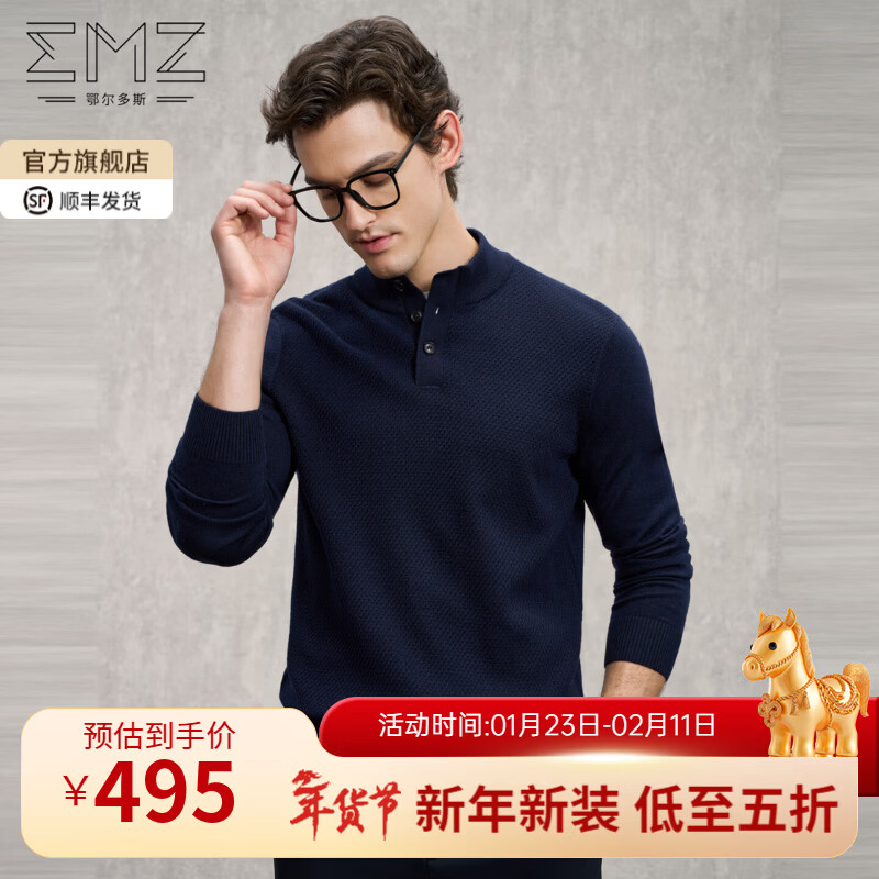 旗舰店EMZ鄂尔多斯100%纯羊毛衫老钱风针织衫毛线衣男春节拜新年马年红色 藏青 L 175/92A
