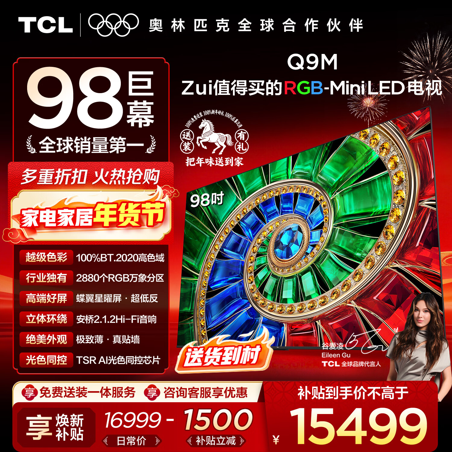 自营TCL电视 98Q9M 98英寸 RGB-Mini LED 100%BT.2020高色域 RGB万象分区 蝶翼星曜屏 国家补贴 98/100