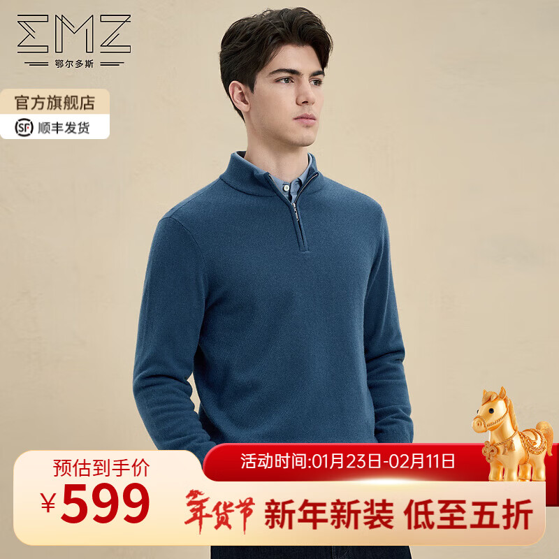 旗舰店EMZ鄂尔多斯【羊毛羊绒】秋冬抗静电抑菌半拉链休闲厚保暖针织毛衣男 兰灰 常规 2XL 185/100A