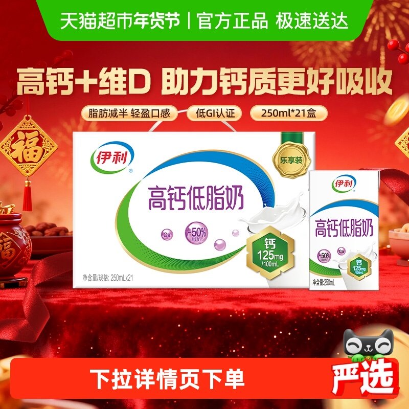 【年货礼盒】伊利高钙低脂牛奶250ml*21盒整箱健身代餐营养早餐