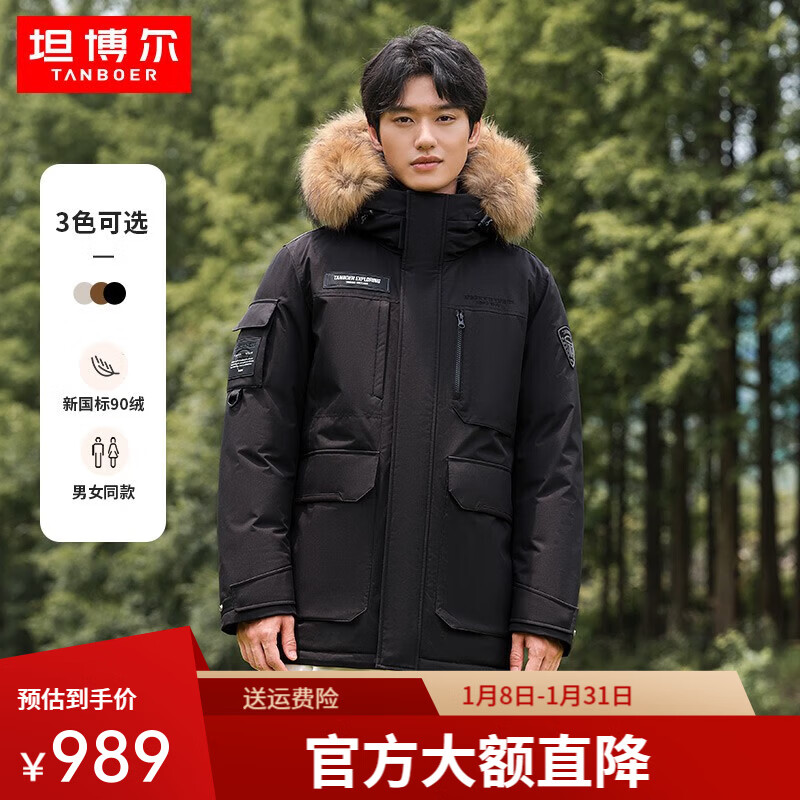 旗舰店坦博尔达人推荐情侣羽绒服男女户外新款貉子毛领连帽工装外套TF236579 黑色 S (160)