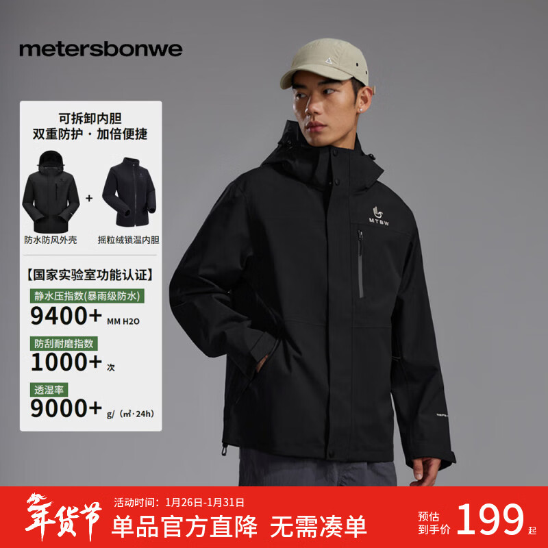 自营美特斯邦威冲锋衣男女同款三合一防污防水两件套秋冬户外保暖外套