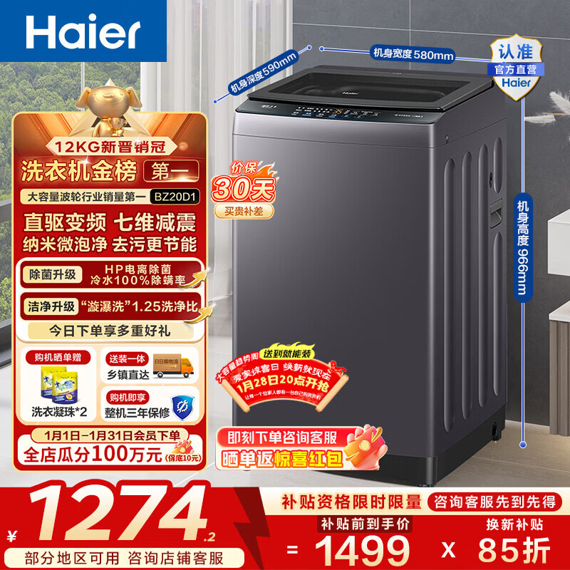 旗舰店海尔(Haier)波轮洗衣机12公斤全自动懒人家用大容量直驱变频一级能效除菌漩瀑洗1.25洗净比 BZ20D1换新补贴15%