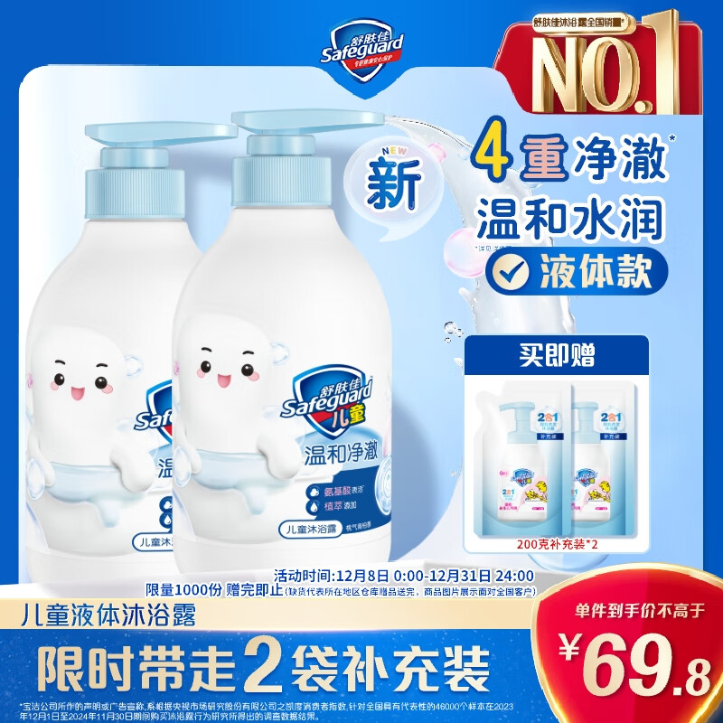 自营舒肤佳儿童沐浴露洗发水二合一 桃气青柚香450g*2 温和净澈水润肌肤