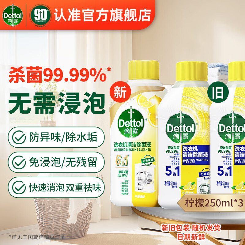 旗舰店滴露(Dettol)洗衣机清洗剂 强力除垢杀菌消毒液滚筒波轮洗衣机深度免浸清洁剂 250ml 3瓶 经典柠檬