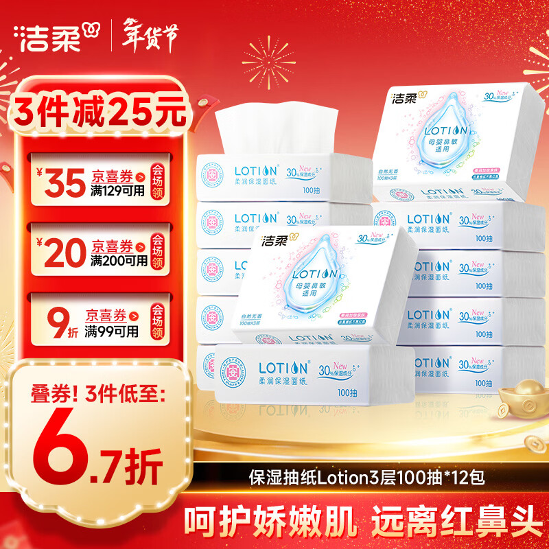 自营洁柔乳霜纸 保湿抽纸Lotion3层100抽*12包 亲肤云柔巾 婴儿纸巾整箱