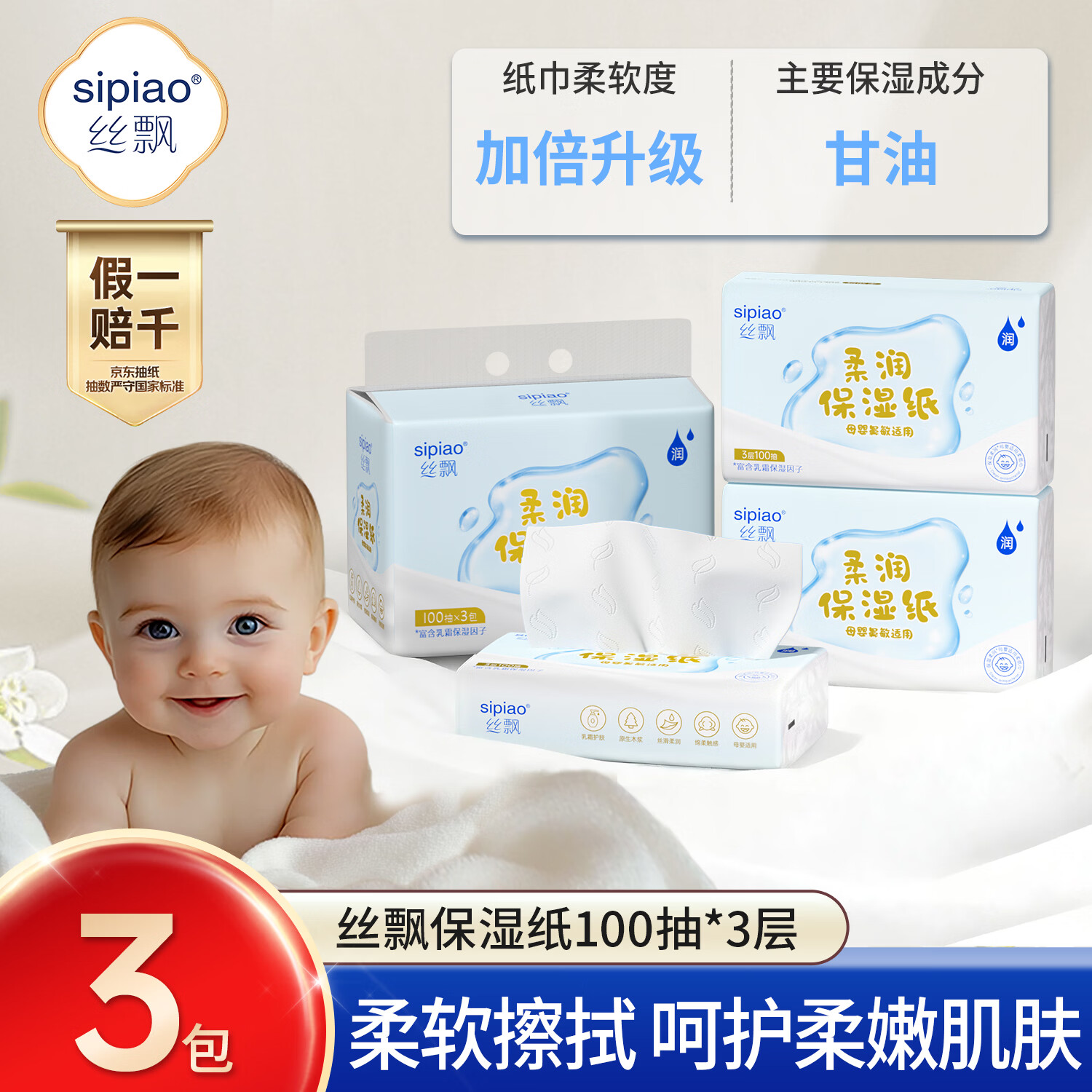 自营丝飘(SIPIAO)婴儿乳霜纸云柔巾保湿纸巾100抽*3包儿童超柔软抽擦鼻纸巾家庭装