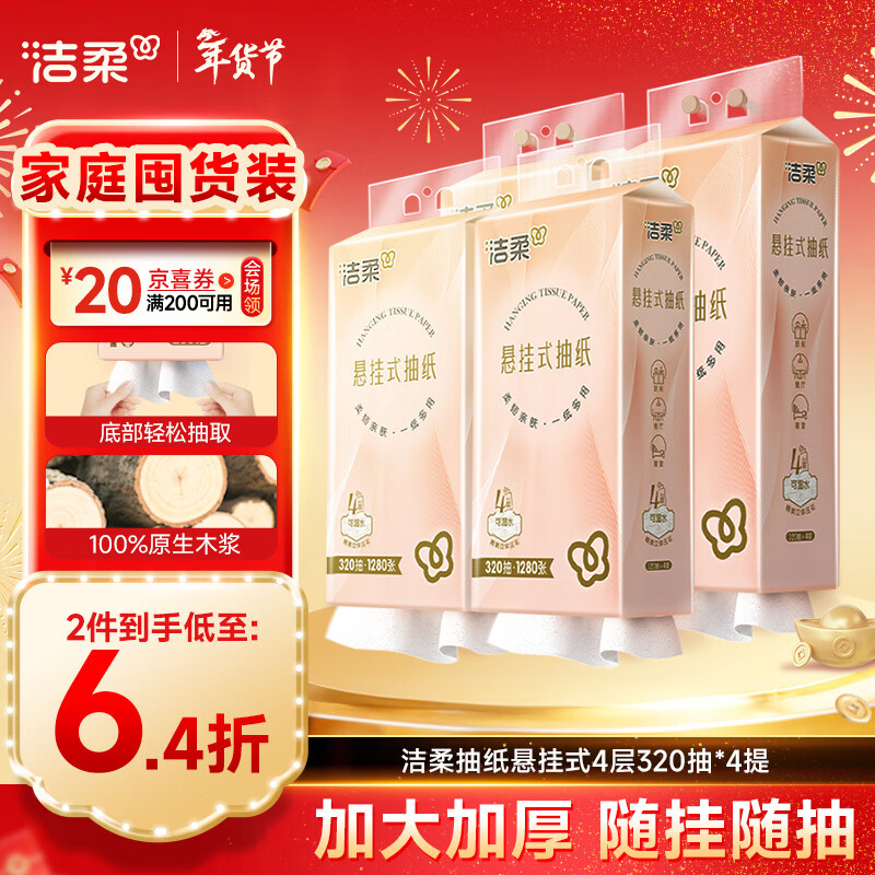 自营洁柔抽纸悬挂式抽纸 4层320抽*4提挂抽 纸巾抽纸 整箱面巾纸