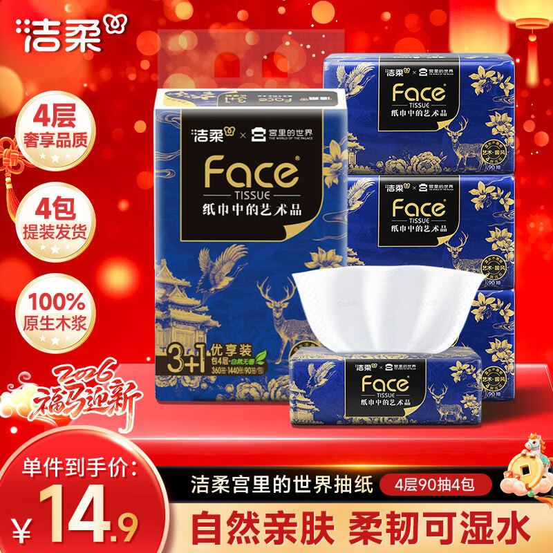 旗舰店洁柔抽纸艺术×宫里的世界软抽四层压花可湿水面巾纸国风擦手纸卫生纸 4层 90抽*4包