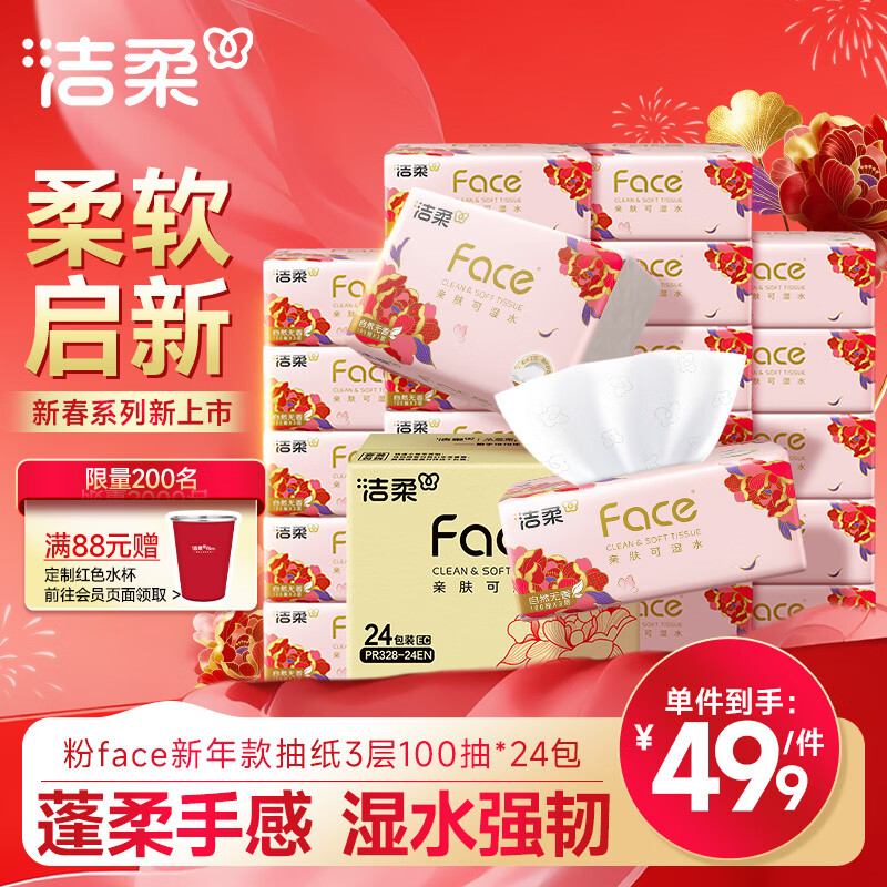 自营洁柔抽纸 粉face纸巾3层100抽*24包 新年款 可湿水面巾纸 整箱卫生纸