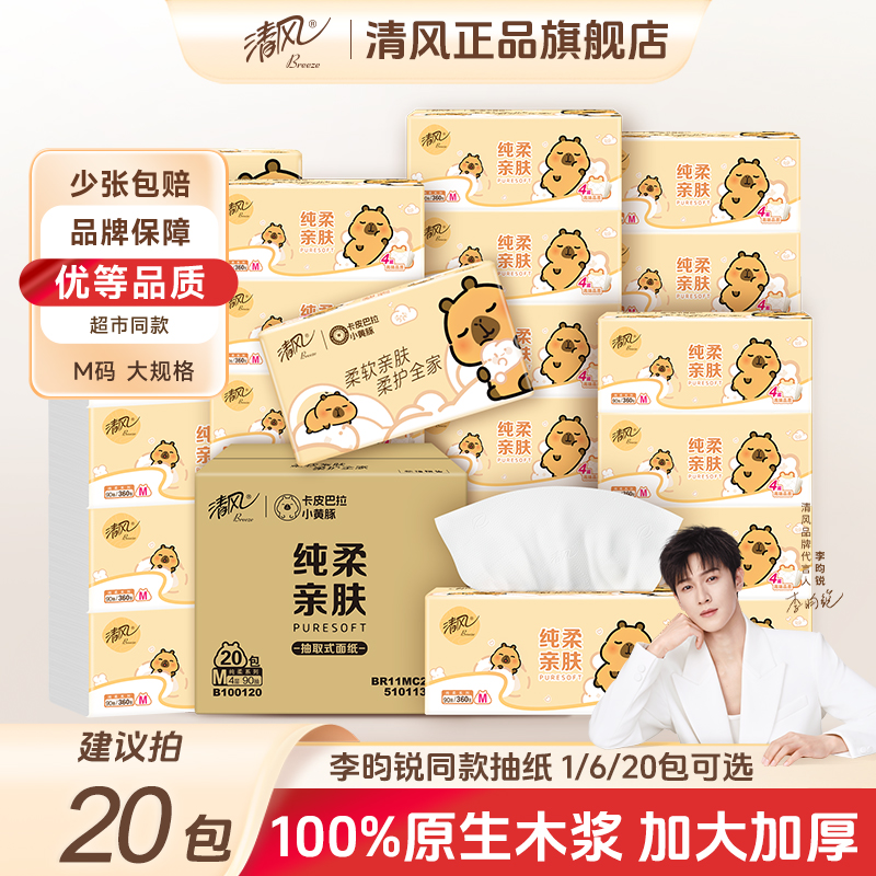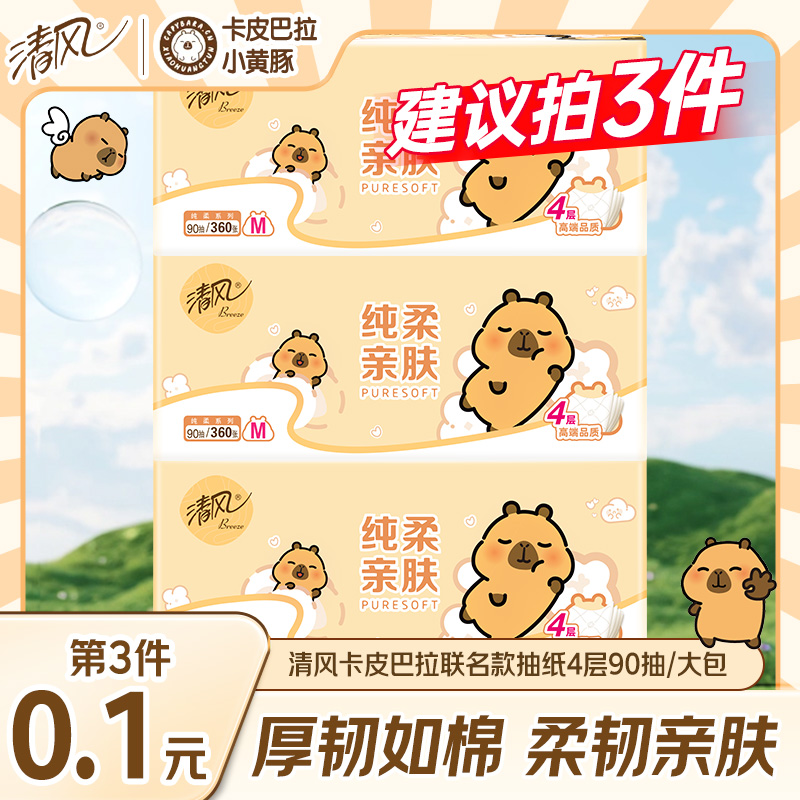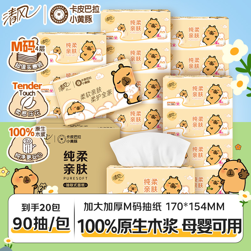 旗舰店【旗舰店发货】清风卡皮巴拉抽纸90抽大包M码纸巾家用亲肤面巾纸