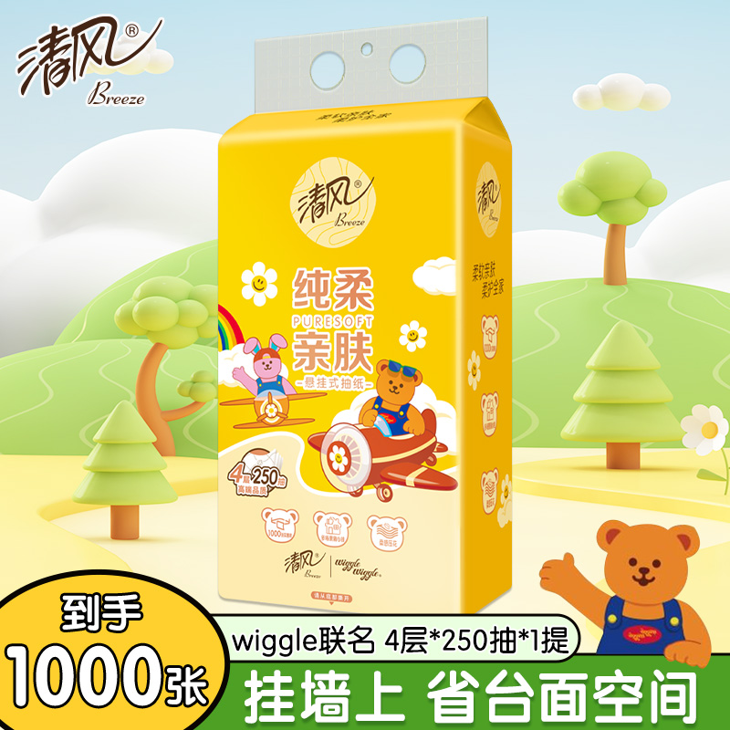 旗舰店清风wiggle联名款4层250抽10包清洁去污普通抽纸挂抽面巾纸底部抽