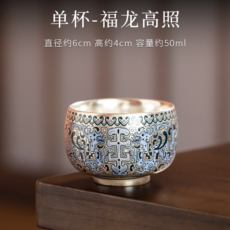 旗舰店景盏金银错纯手工鎏银茶杯茶壶999纯银汉瓦壶高档功夫茶具礼盒送长辈 银措饕餮-单杯简装