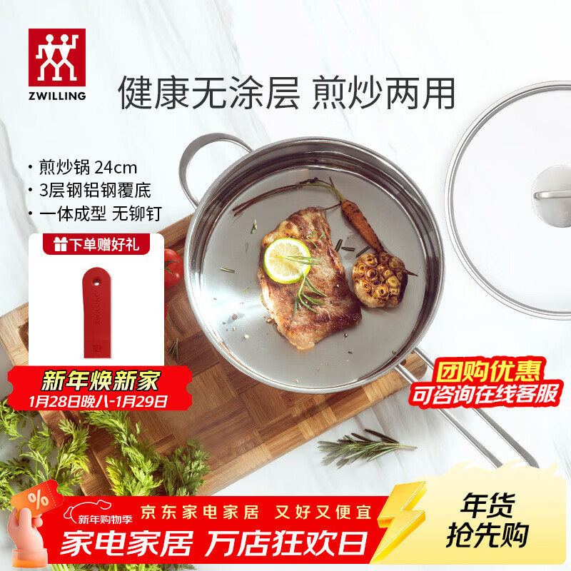 旗舰店双立人(ZWILLING)平底锅不锈钢煎锅炒菜锅24cm无涂层电磁炉燃气灶通用Nova Plus Nova Plus煎炒锅(含锅盖) 24cm