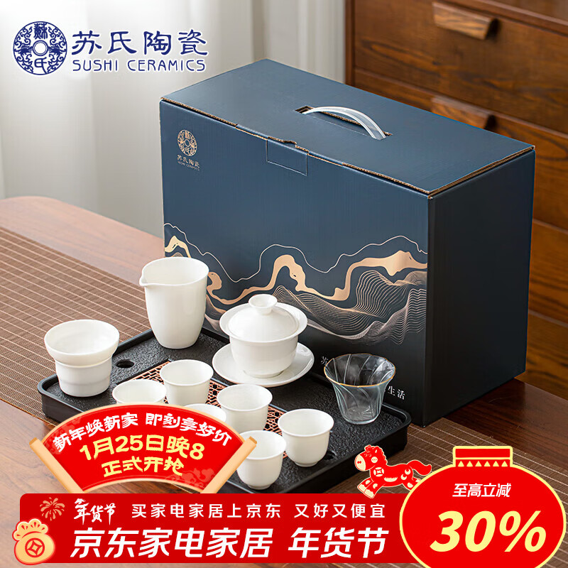 自营苏氏陶瓷新年礼物羊脂玉白瓷悬停盖碗功夫茶具茶盘套装平价礼品团购节日礼