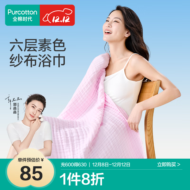 自营全棉时代浴巾纯棉速吸易干六层素色水洗纱布浴巾经典粉 80cm×140cm