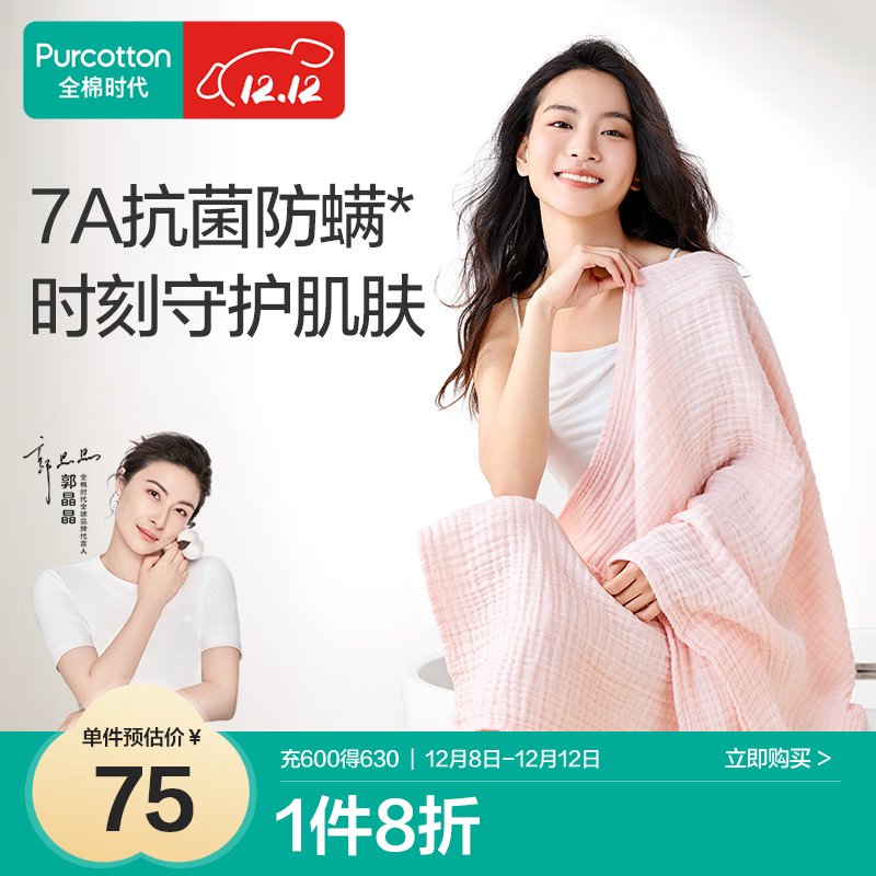 自营全棉时代浴巾纯棉速吸四层一体抗菌防螨水洗纱布浴巾棉花糖-粉80×140cm