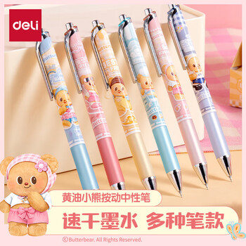自营得力(deli)黄油小熊速干按动中性笔盲盒笔 0.5mmST头高颜值学生中性笔HY022 黑色单支装