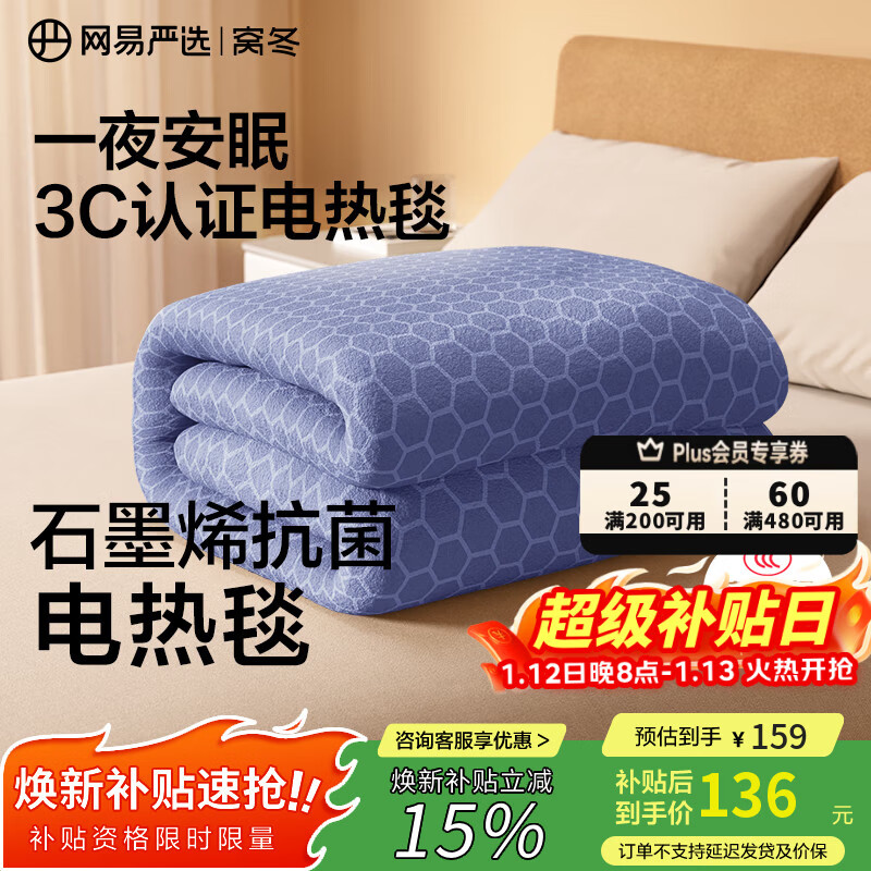 自营网易严选【高温断电】石墨烯电热毯单人电热褥子4档智能款 藏青色1.8*0.8m