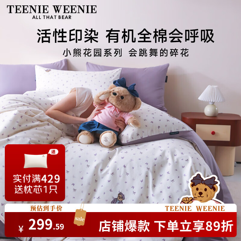 自营Teenie Weenie小熊床上四件套纯棉100%A类全棉床单四件套1.5m床双人床单被套200*230cm茶语淡紫