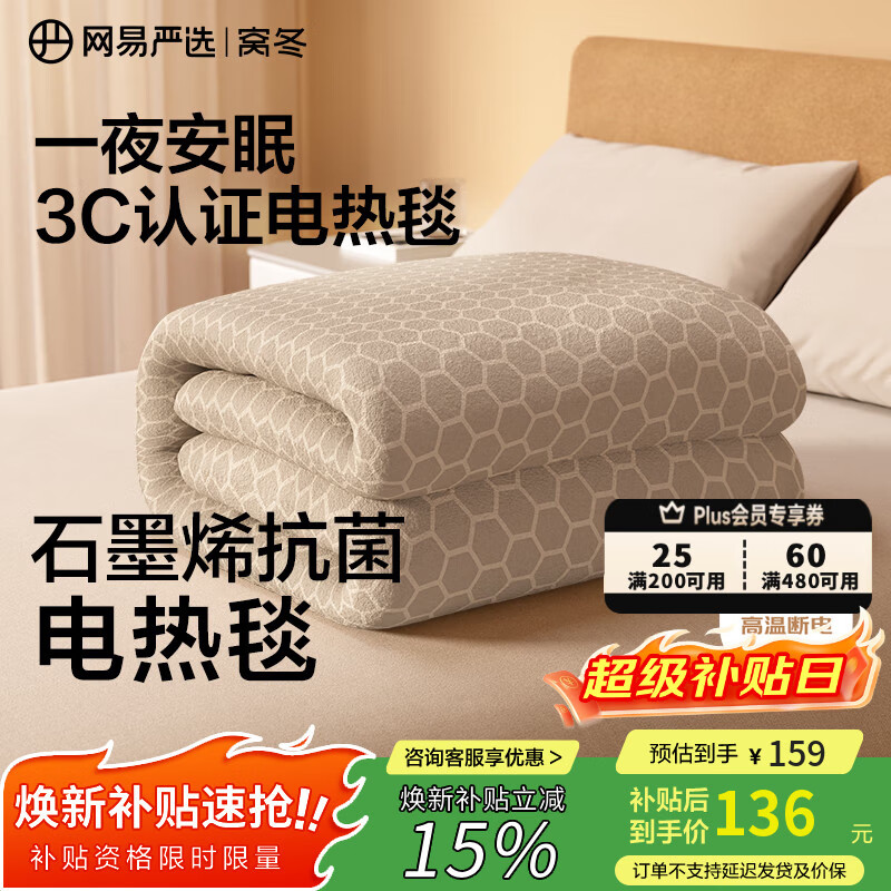 自营网易严选【真机洗】石墨烯电热毯单人电热褥子4档智能款燕麦灰 1.8*0.8m