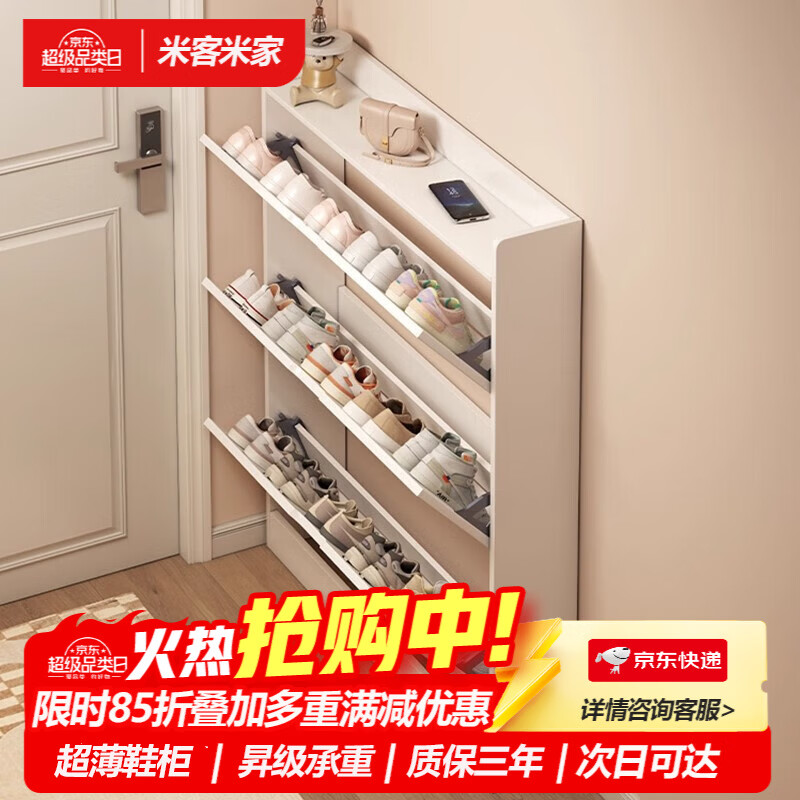 旗舰店米客米家(MIKEMIJIA)实木翻斗鞋柜家用门口薄储物柜新款2024靠墙玄关柜一体鞋架 【三门款】暖白色80*17*120cm 组装
