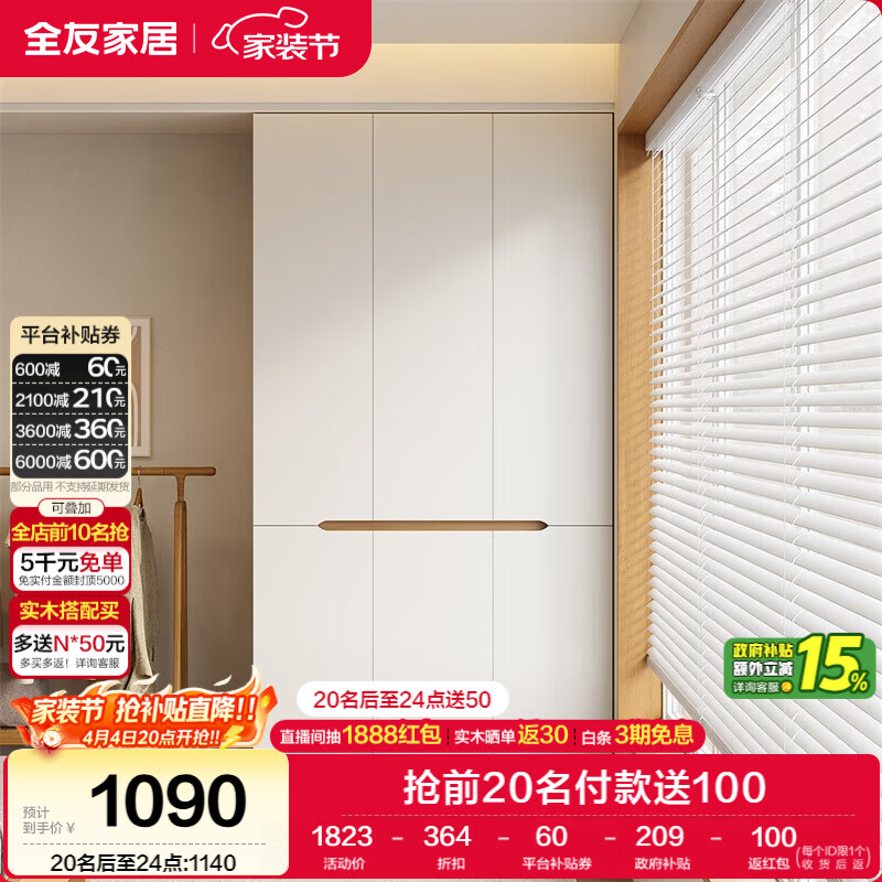 自营全友家居简约奶油风加高三门衣柜卧室家用衣橱衣服收纳储物柜一体靠墙