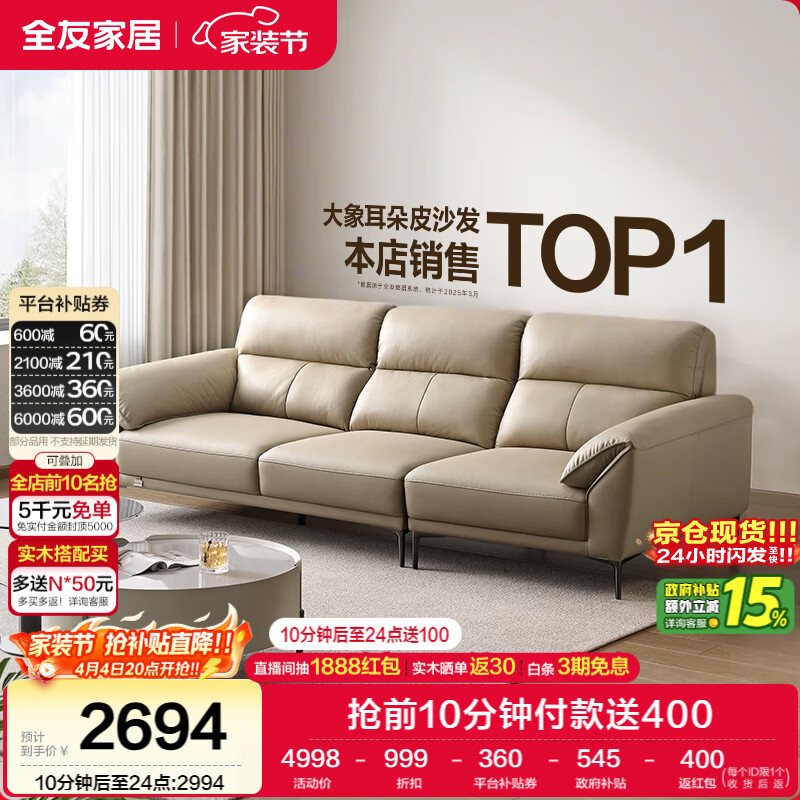 自营全友家居真皮沙发大象耳朵头层牛皮艺大户型客厅实木内架直排沙发家用