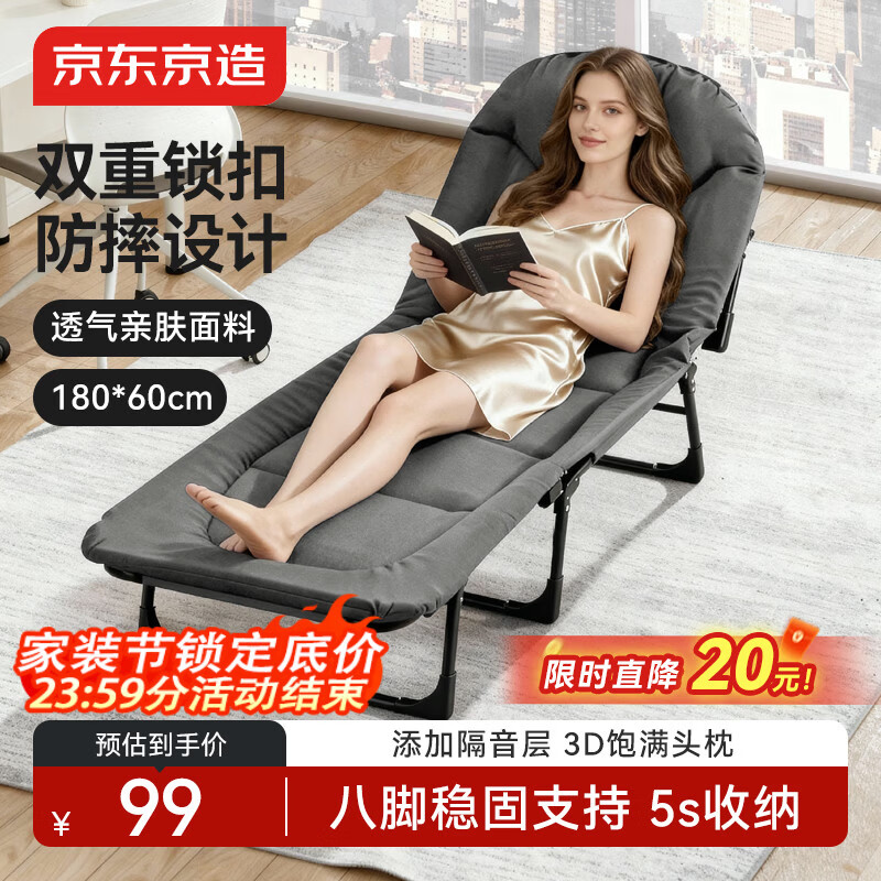 自营京东京造折叠床躺椅美式单人午休床医院陪护床户外行军床可坐可躺180*60cm