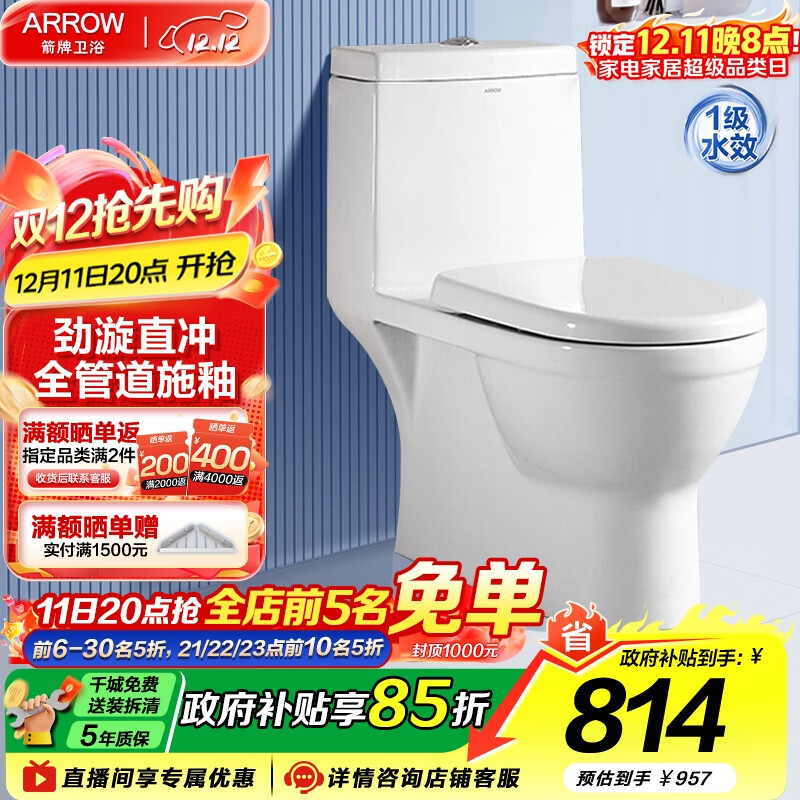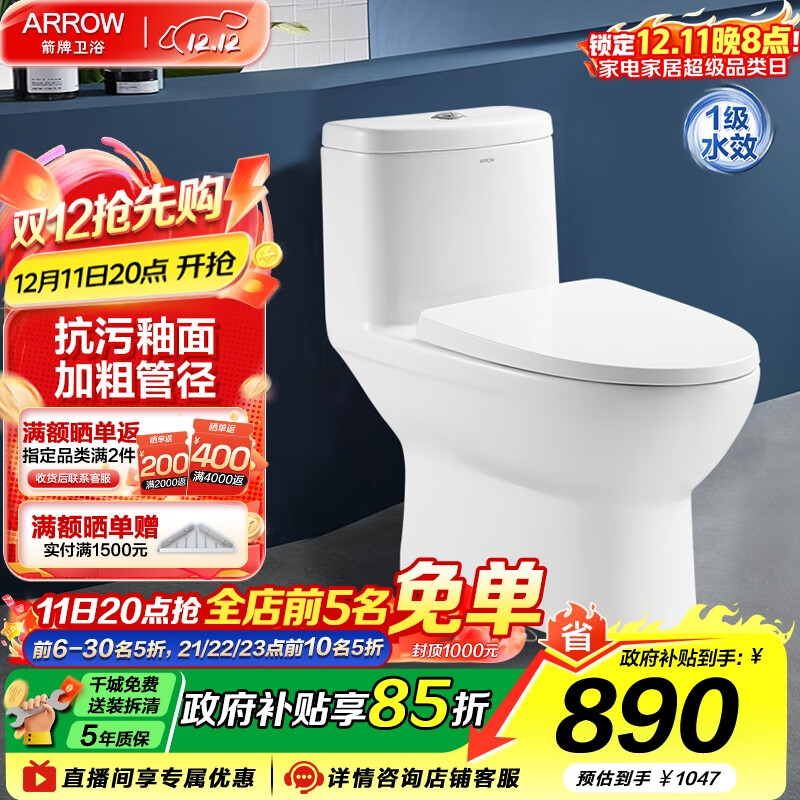 旗舰店箭牌(ARROW) 卫浴大冲力喷射虹吸防臭节水马桶加大管道缓降盖板连体坐便器T71 AE1126 350坑距