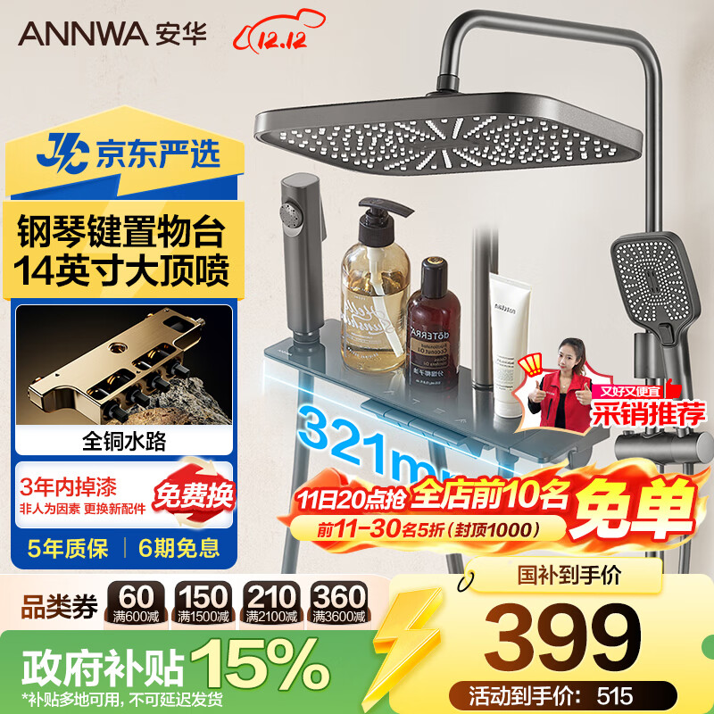 自营安华卫浴淋浴花洒全套黄铜主体增压钢琴键枪灰色圆管套装N4S9048GGW